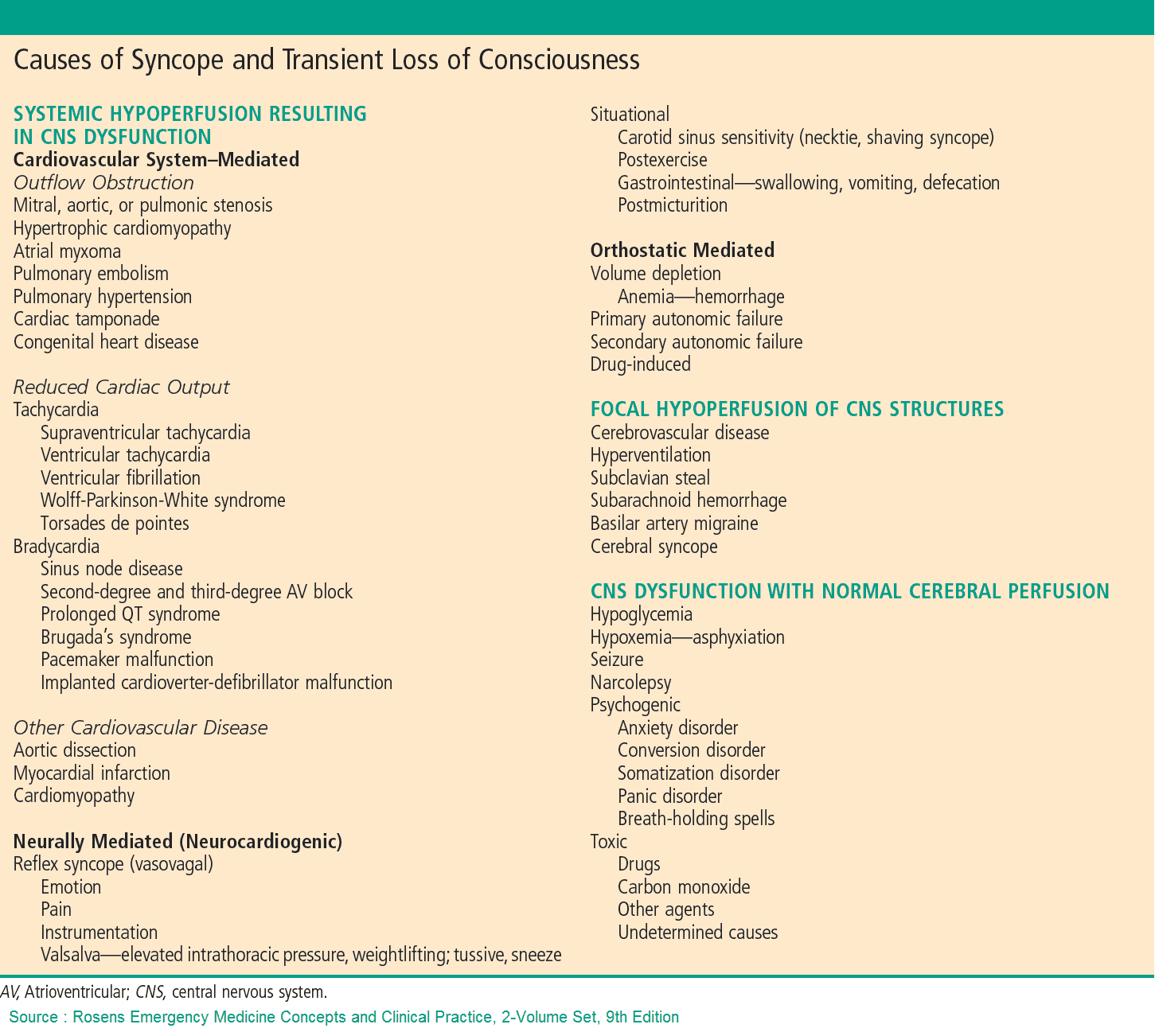 Syncope is caused by a transient loss of consciousness and motor tone due to a reduction in cerebral perfusion. There is spontaneous recovery, and it is often recurrent. Causes and forms of syncope include:
