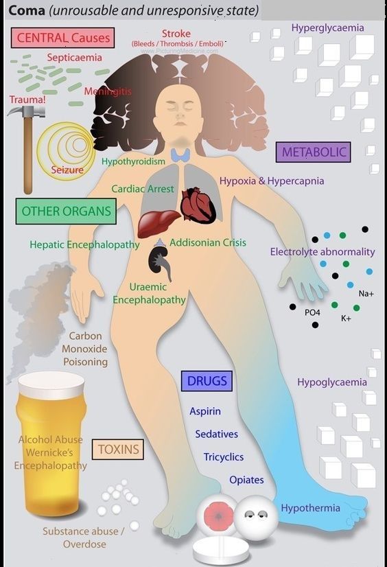 - Drugs overdose: narcotics, barbiturates, benzodiazepines.