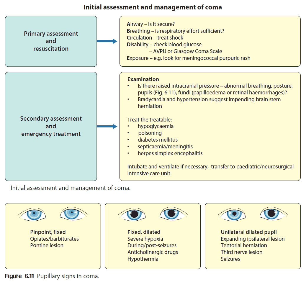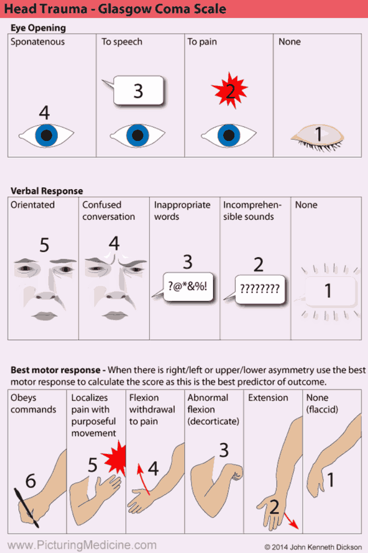In an unconscious patient, the first priority is to establish that there is a patent airway and effective breathing and circulation (ABC). A rapid assessment of the Glasgow coma scale should then be made as shown in the images below.