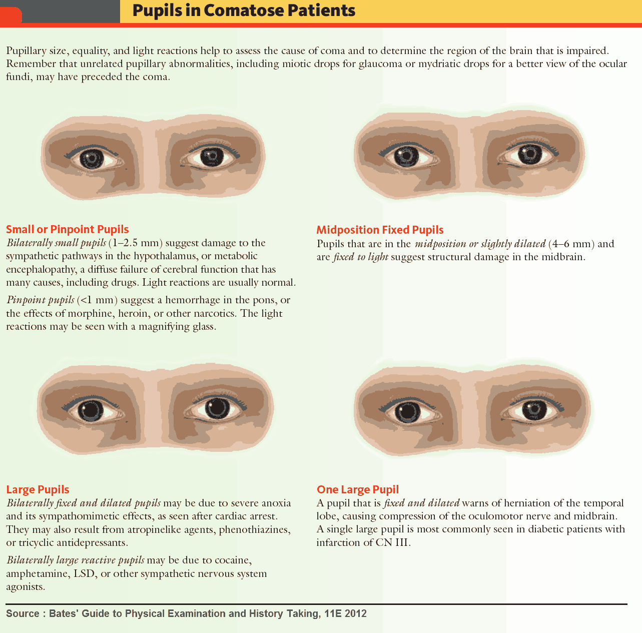 - Needle marks or pinpoint pupils: narcotic overdose.