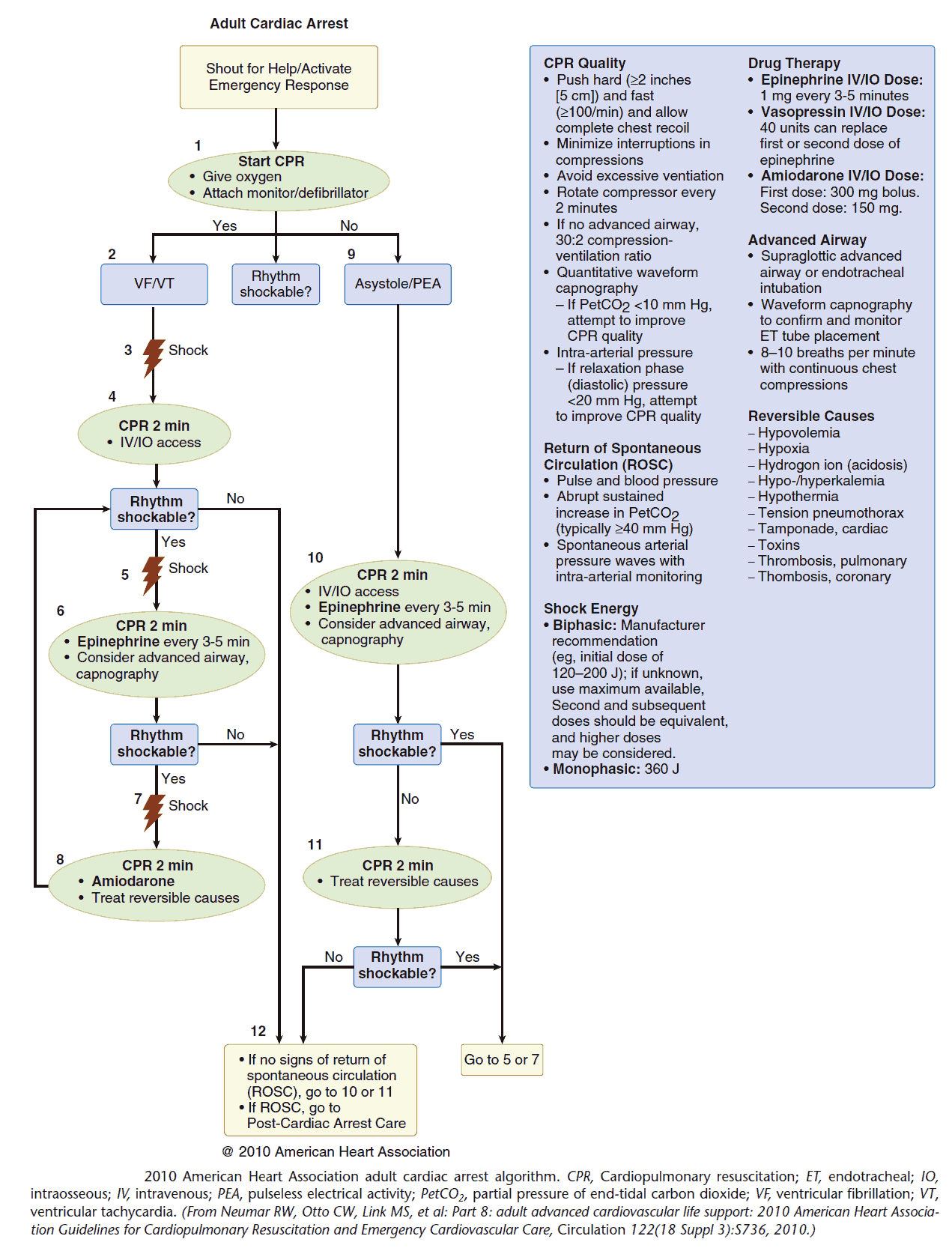 Whether occurring at home, in the public setting, or in the hospital, prompt recognition of Cardiac arrest is key. Early activation of emergency response systems, initiation of high-quality cardiopulmonary resuscitation (CPR), and expedient use of automated external defibrillators (AEDs) are absolutely paramount. Swift deliverance of high-quality CPR can prevent progression of shockable rhythms to nonshockable rhythms and increase successful defibrillation rates, chances for survival, and neurologic integrity.
