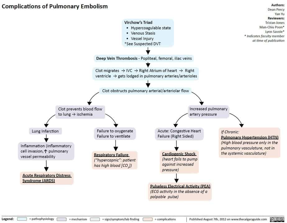 Acute PE interferes with the circulation in the pulmonary bed. If more than 30% to 50% of the total cross-sectional area of the pulmonary arterial bed is occluded by thromboemboli, the pulmonary artery pressure (PAP) increases.
