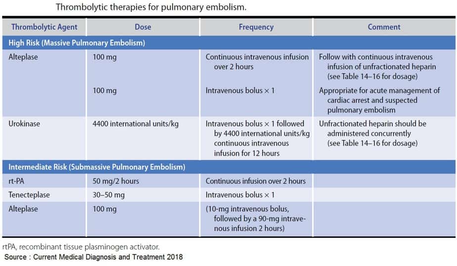 The FDA-recommended infusion dose is for alteplase at 100 mg as a continuous infusion over 2 hours while withholding anticoagulation during the 2-hour infusion period. For this reason, when massive PE is suspected, anticoagulants with prolonged half-lives (such as low molecular weight heparin) should be avoided.