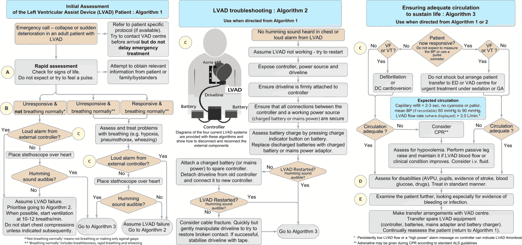 The patient’s chest should be auscultated to determine the presence, or absence, of the continuous hum of the VAD. The absence of an audible hum suggests catastrophic VAD dysfunction and the need for immediate resuscitation.