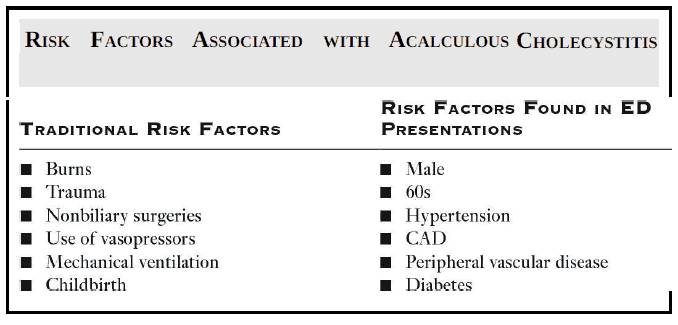 With the rise of intensive care units, the prevalence of acalculous cholecystitis also grew. Now that modern medicine allows patients to live longer with multiple comorbidities, we have even seen this disease in the outpatient setting. The key to diagnosis starts with an awareness of the unique set of risk factors these patients have (see image bellow).