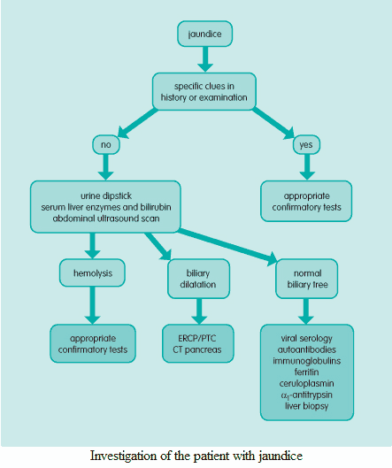 The investigation of jaundiced patients falls into two stages. Firstly, the type of jaundice must be determined (prehepatic, intrahepatic, posthepatic). Then more detailed tests should be performed to determine the specific etiology.