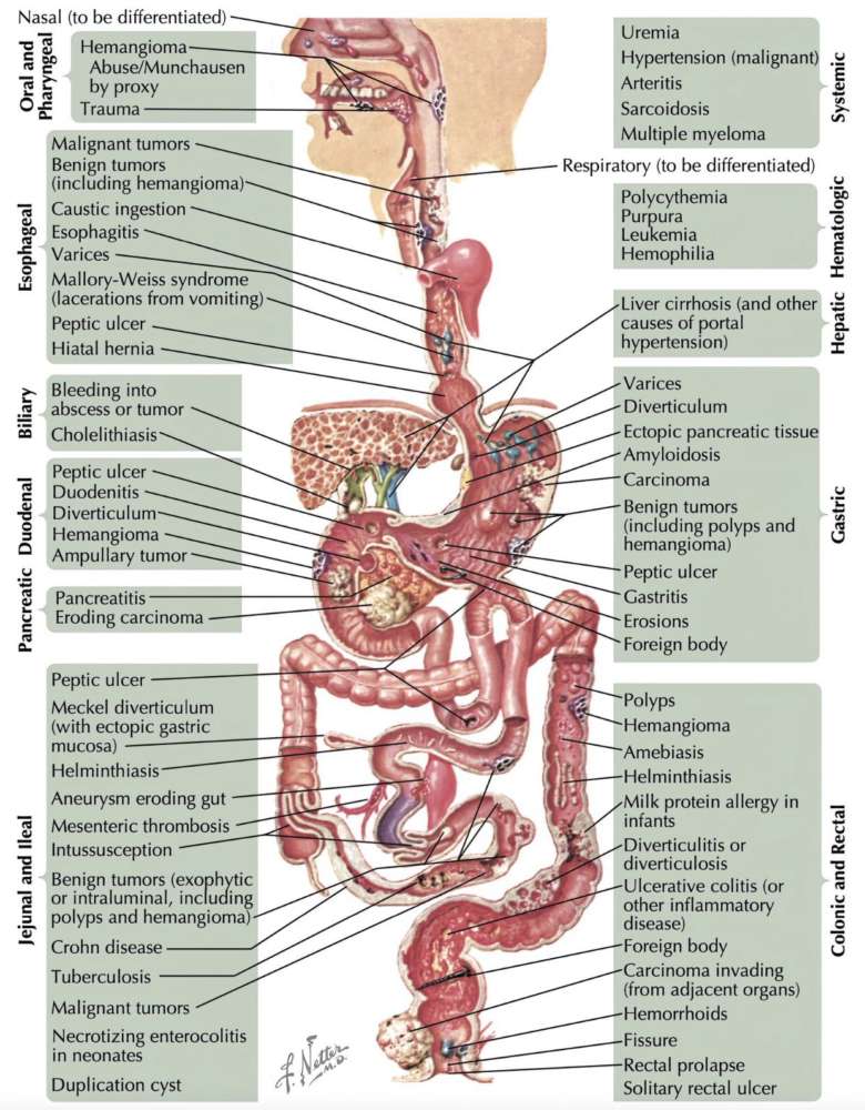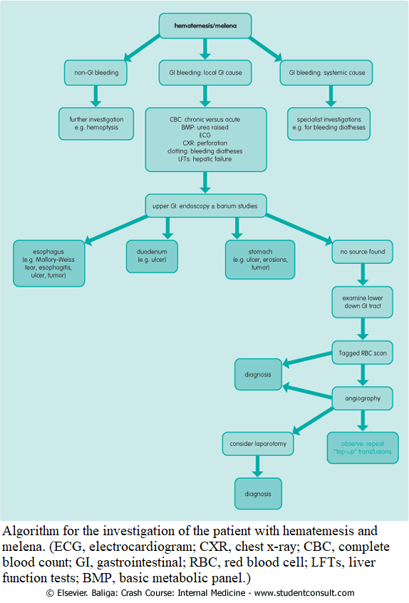 Differential diagnosis of hematemesis, hematochezia, and melena