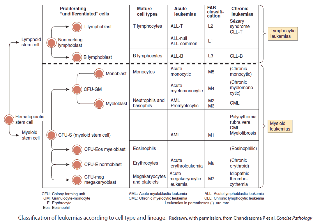 In the acute leukemias, there is a proliferation of early lymphoid and myeloid precursors (called blasts) which do not mature. The clinical course is very aggressive and rapidly fatal without treatment.