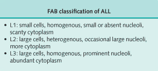 - Cytogenetic abnormalities may be present (e.g. hyperdiploidy or the Philadelphia chromosome [Ph]).