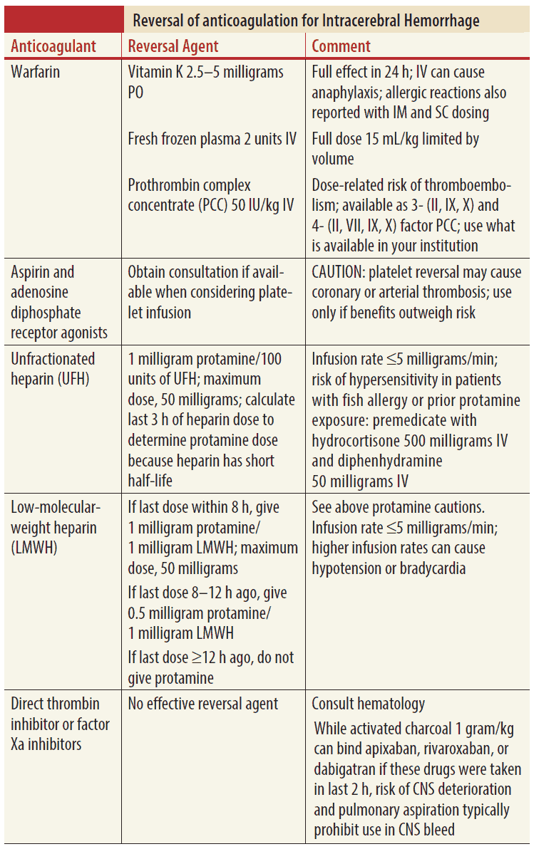 A classic scenario of life-threatening hemorrhage requiring emergent anticoagulant reversal is that of intracranial hemorrhage (ICH). We extrapolate recommendations for other hemorrhages from this often-studied patient group. The objectives of this article are to: