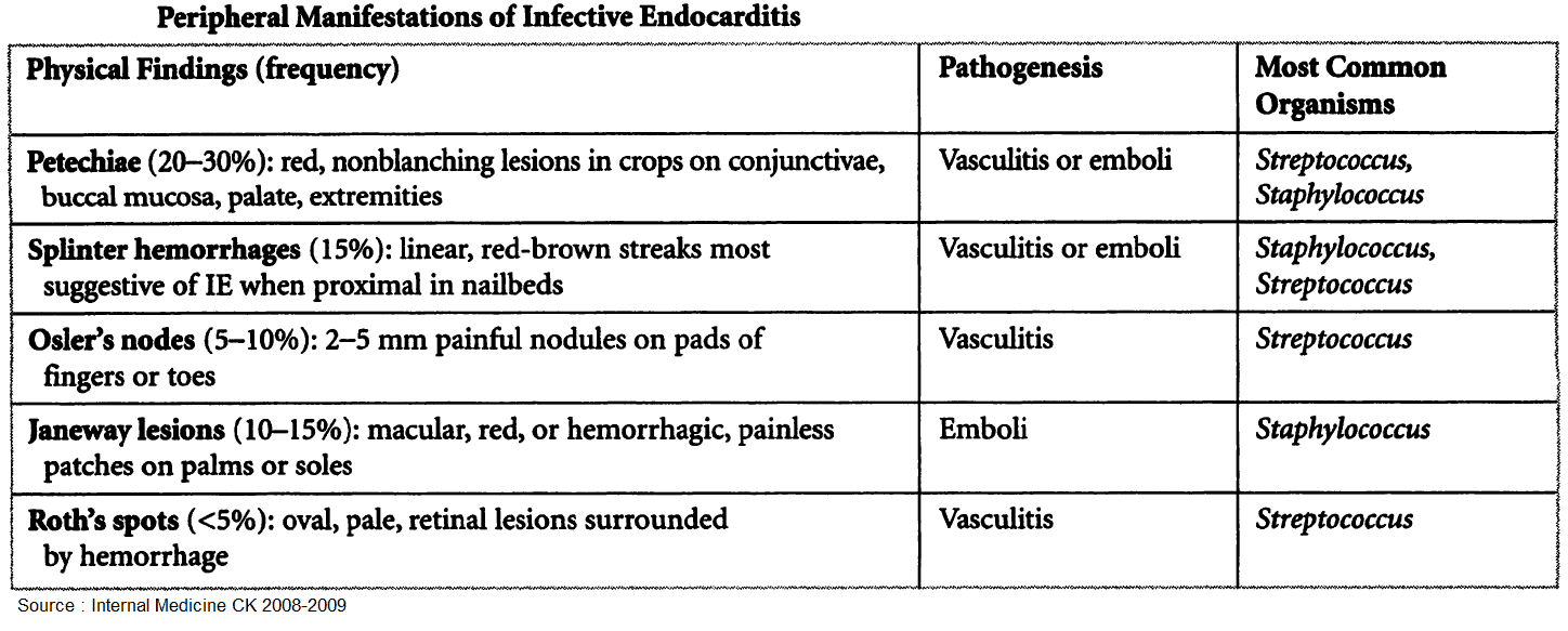 Classic signs of Infective Endocarditis such as Osler nodes, Janeway lesions, and Roth spots are infrequently seen. The Duke Criteria can be used for timely diagnosis and risk stratification of patients with Infective Endocarditis.