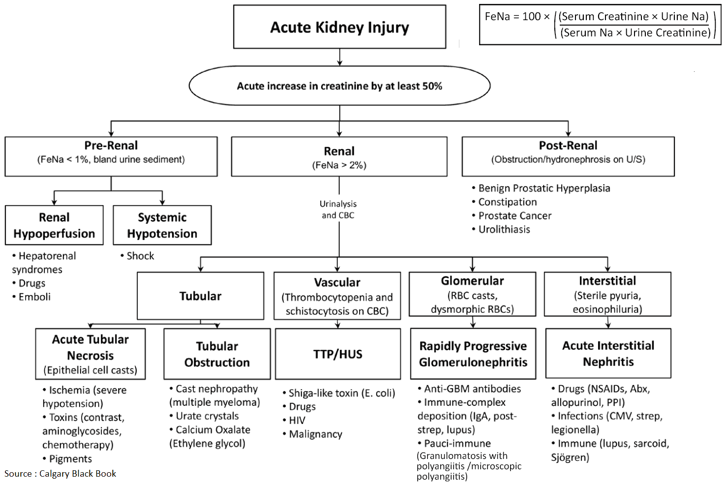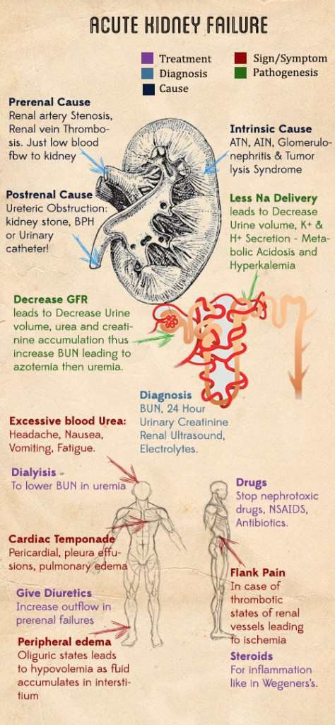 It is useful to classify ARF into prerenal, renal, and postrenal causes (see pictures below). However, the etiology is often multifactorial. For example, in postsurgical ARF, fluid depletion, systemic infection, and nephrotoxic drugs may all play a role. ARF may also complicate chronic renal failure.