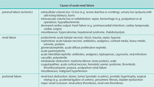 The clinical features depend on whether there is pre-existing chronic renal impairment and whether the cause is pre-, renal-, or post-renal failure. A full history should be taken, focusing on previous renal disease, a history of hypertension or analgesic abuse, symptoms of prostatism, recent diarrhea, vomiting or blood loss, and recent operations.