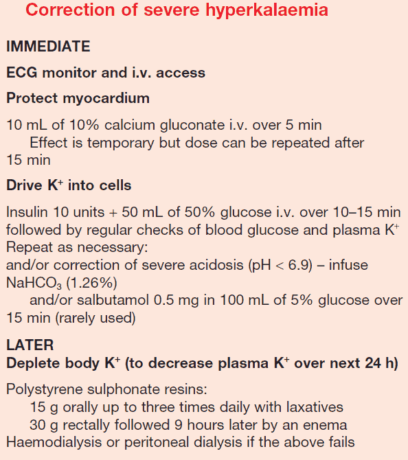 Potassium should be redistributed intracellularly by the correction of acidosis with sodium bicarbonate 100-150 mmol/L and the administration of glucose 50-100 mg. Insulin may be necessary to control hyperglycemia. It is usually necessary to give these drugs in small volumes in order to avoid fluid overload. Polystyrene sulphonate resin (Kayexalate), 20 g 6 hourly orally, or as an enema (30 g), will maintain a low potassium.