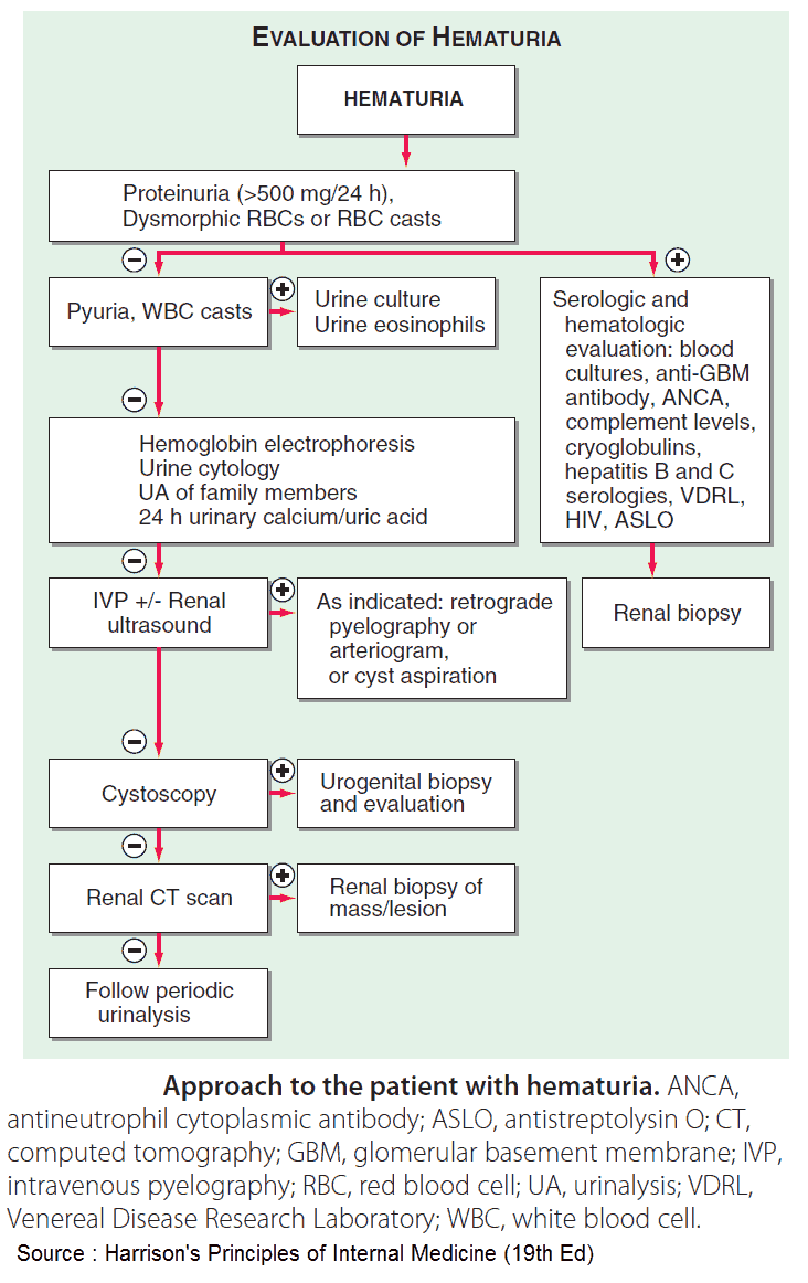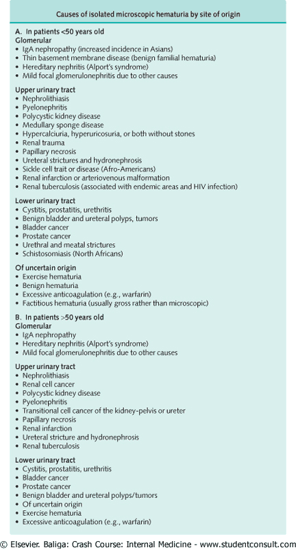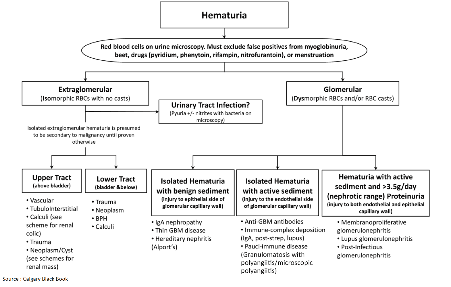 Patients need to be stratified by the quantity of hematuria, age, symptoms, past medical history, and family history in addition to whether proteinuria is also present. It is important to rule out life-threatening causes since urologic cancers are the cause of 5% of cases of microscopic hematuria.