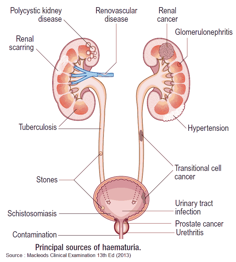 - If the urine is evenly blood stained throughout micturition, the site of pathology is likely to be the kidney or ureter.