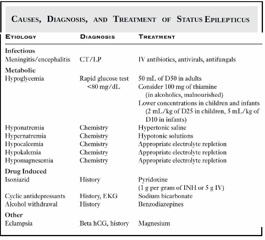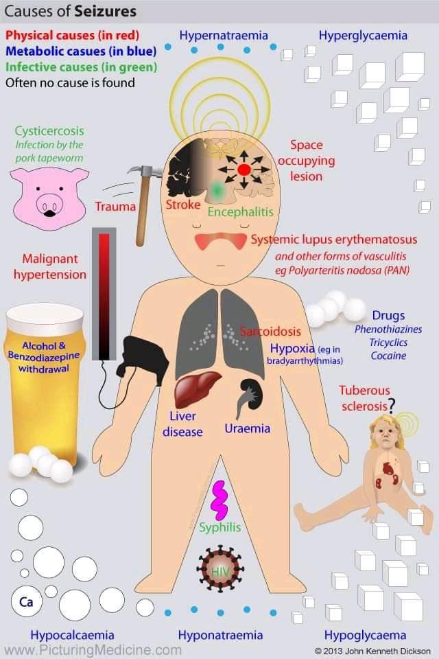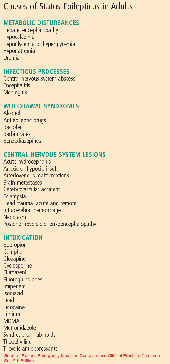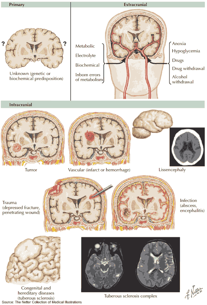 - Metabolic causes: hypoxia, hyper- or hypoglycemia, hypocalcemia, uremia, alcoholism, hypo- and hypernatremia, liver failure, pyridoxine deficiency.