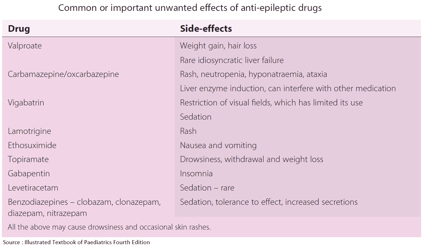 Common unwanted effects of valproate include weight gain, hair thinning, and tremor. Hepatotoxicity, thrombocytopenia, and pancreatitis may occur. Note that loading a patient with phenytoin after a seizure (usually 20 mg/kg) can lead to hypotension. Use of fosphenytoin can prevent this side effect. Ethosuximide and valproate are useful alternatives in children with absence seizures only.