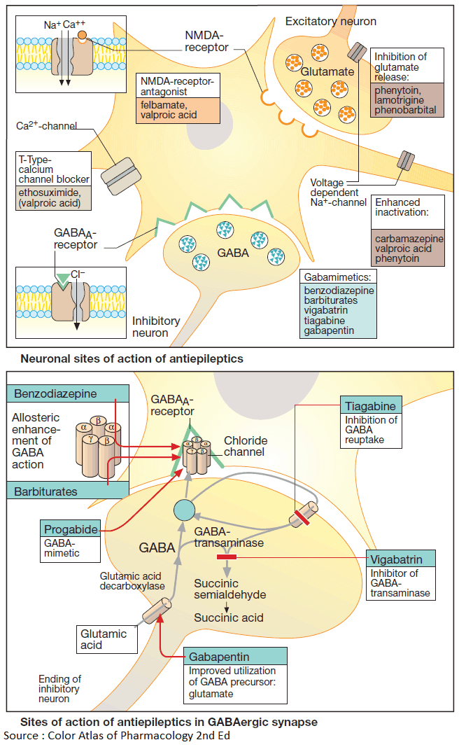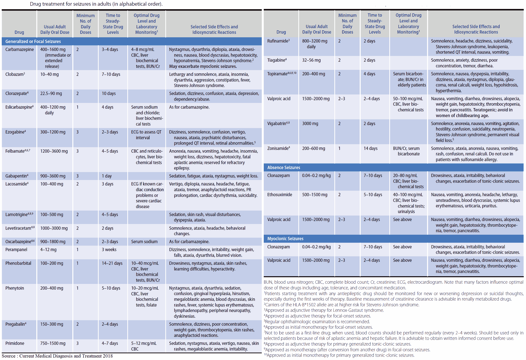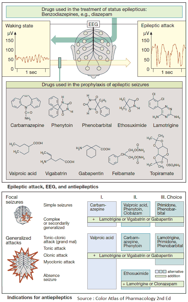 Phenytoin is often recommended as the treatment of choice because carbamazepine is ineffective for the treatment of absence or myoclonic seizures. Phenytoin, valproate, and carabmazepine are equally as effective for idiopathic generalized tonic-clonic seizures.