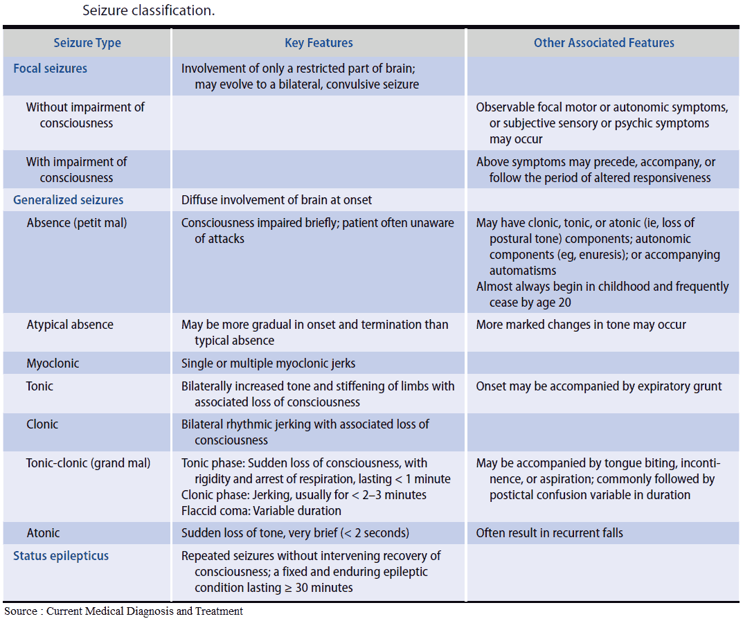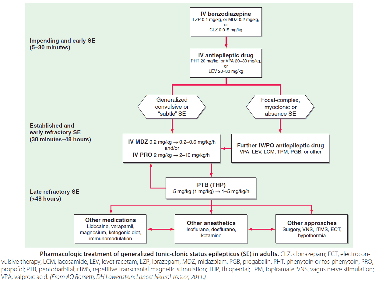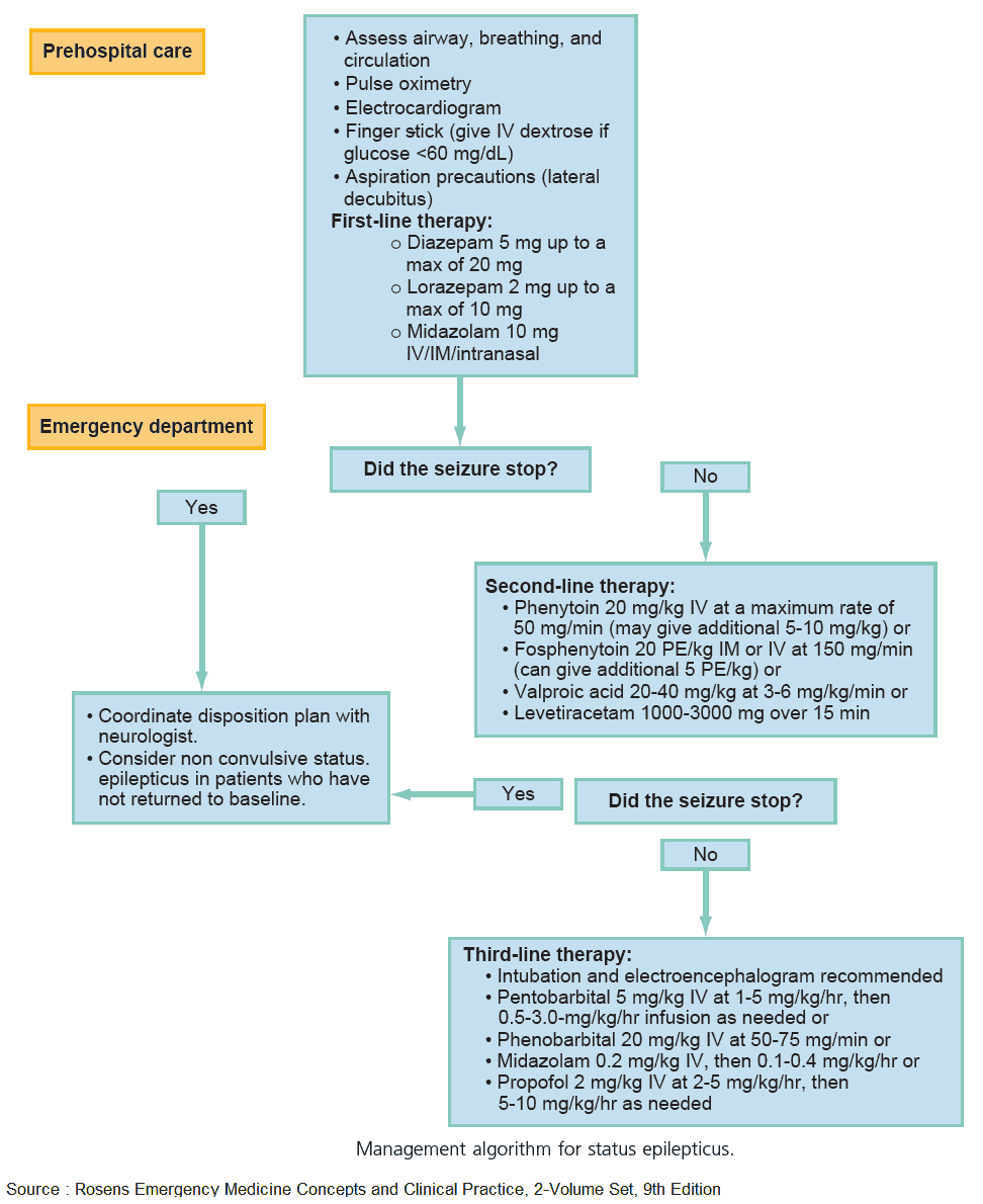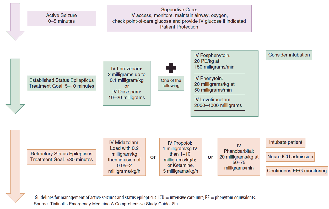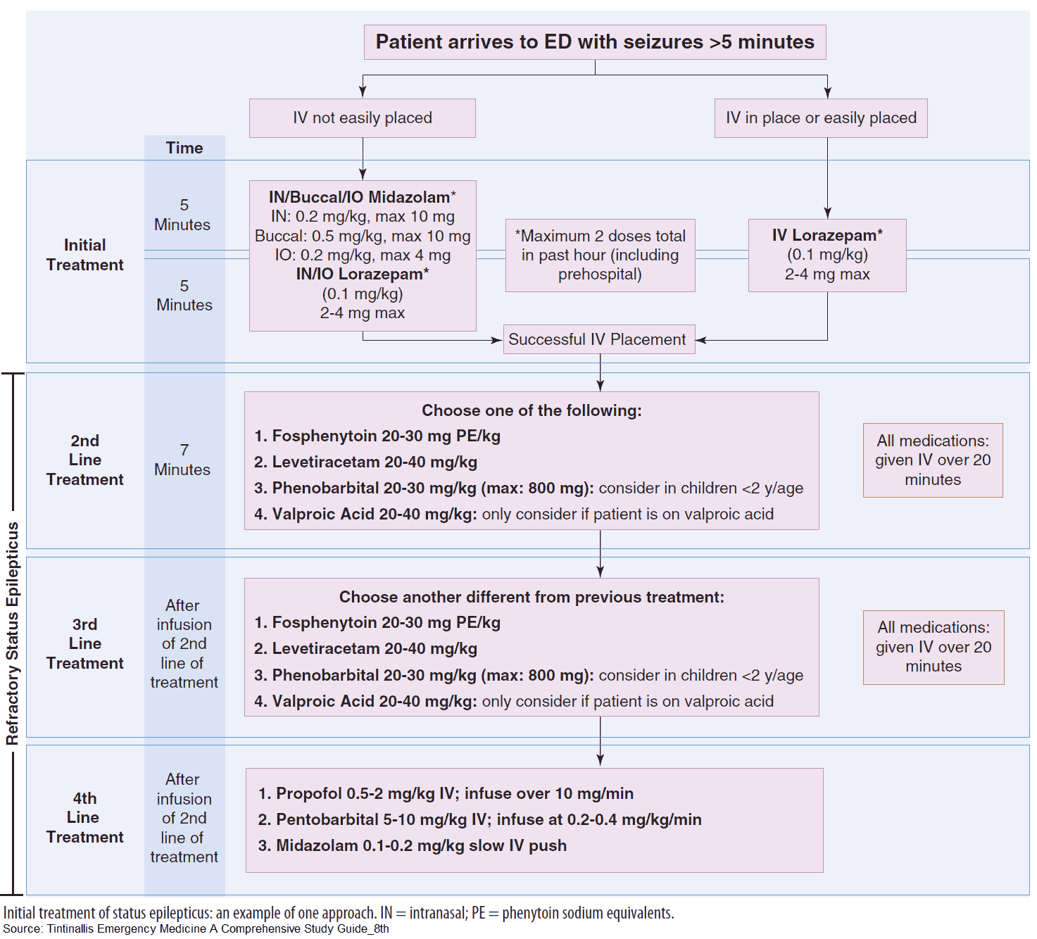 Status, as it is known, is defined as continuous seizure activity for over 5 minutes (some still define status as seizure activity lasting over 30 minutes). It can lead to rhabdomyolysis, lactic acidosis, aspiration pneumonitis, and respiratory failure. Neuronal death can occur after 30 to 60 minutes of continuous seizure activity. Treatment should start with 0.2 mg/kg of diazepam, followed by 20 mg/dk of phenytoin.