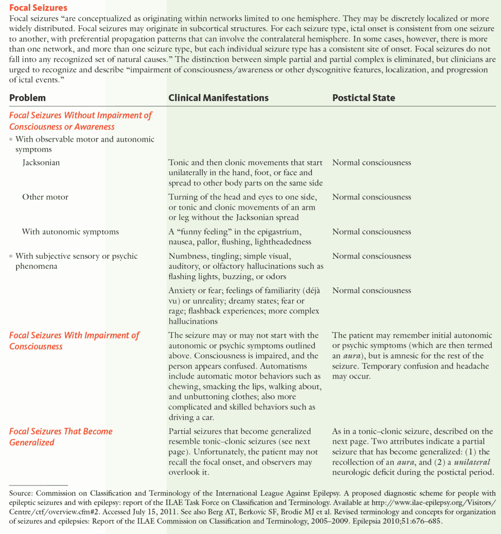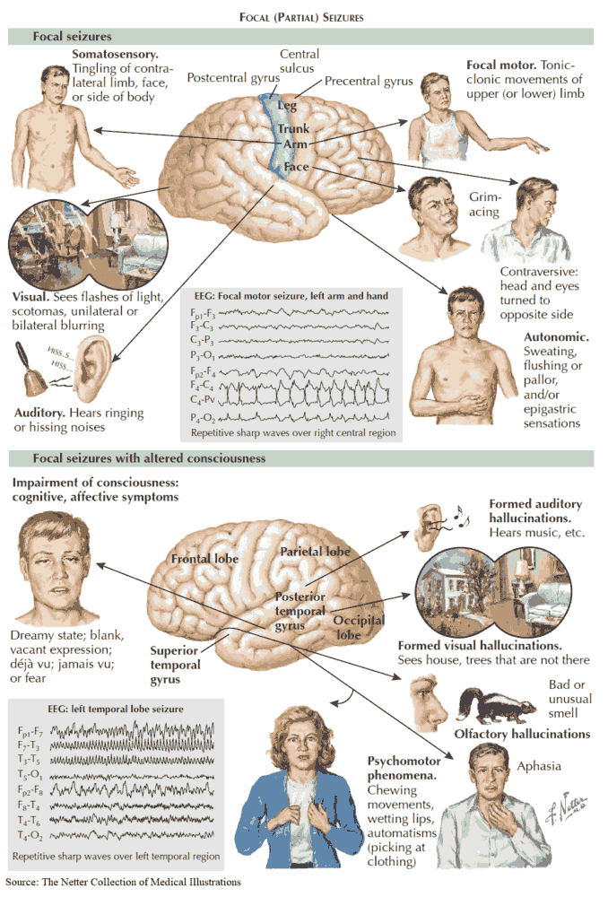 These have a focus of activity (e.g., a tumor or scar tissue caused by trauma or stroke), from which epileptic activity begins and then spreads. They may lead to generalized tonic-clonic seizures. The nature of the attack varies according to the primary site of the lesion. Examples include focal motor attacks, focal sensory attacks, and temporal lobe epilepsy.