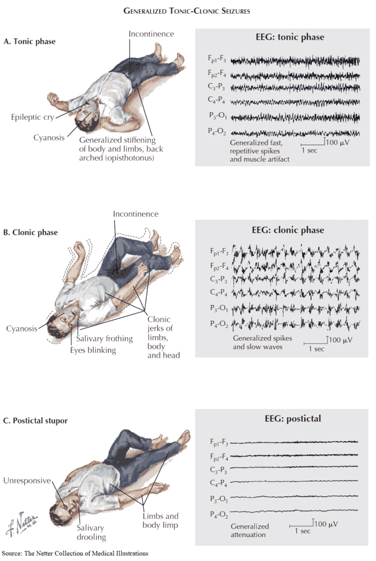After about a minute, the clonic phase starts, consisting of violent convulsive movements. There may be tongue biting and urinary or fecal incontinence. The patient then becomes drowsy or will sleep for several hours. The reflexes are depressed, with a positive Babinski sign. The patient may be confused on waking (postictal confusion).