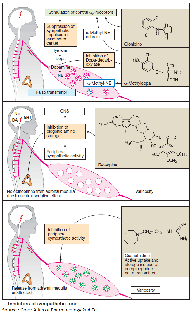 Antiadrenergics are drugs capable of lowering transmitter output from sympathetic neurons, i.e., “sympathetic tone”. Their action is hypotensive (indication: hypertension) however, being poorly tolerated, they enjoy only limited therapeutic use.