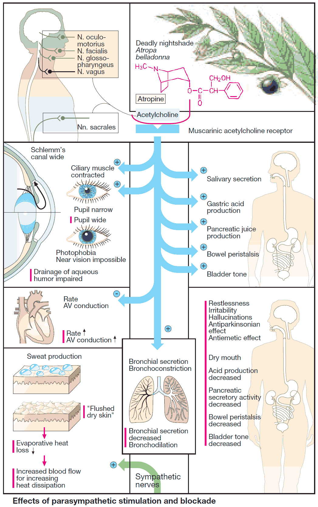 Excitation of the parasympathetic division of the autonomic nervous system causes release of acetylcholine at neuroeffector junctions in different target organs. The major effects are summarized in (image). Some of these effects have therapeutic applications, as indicated by the clinical uses of parasympathomimetics.