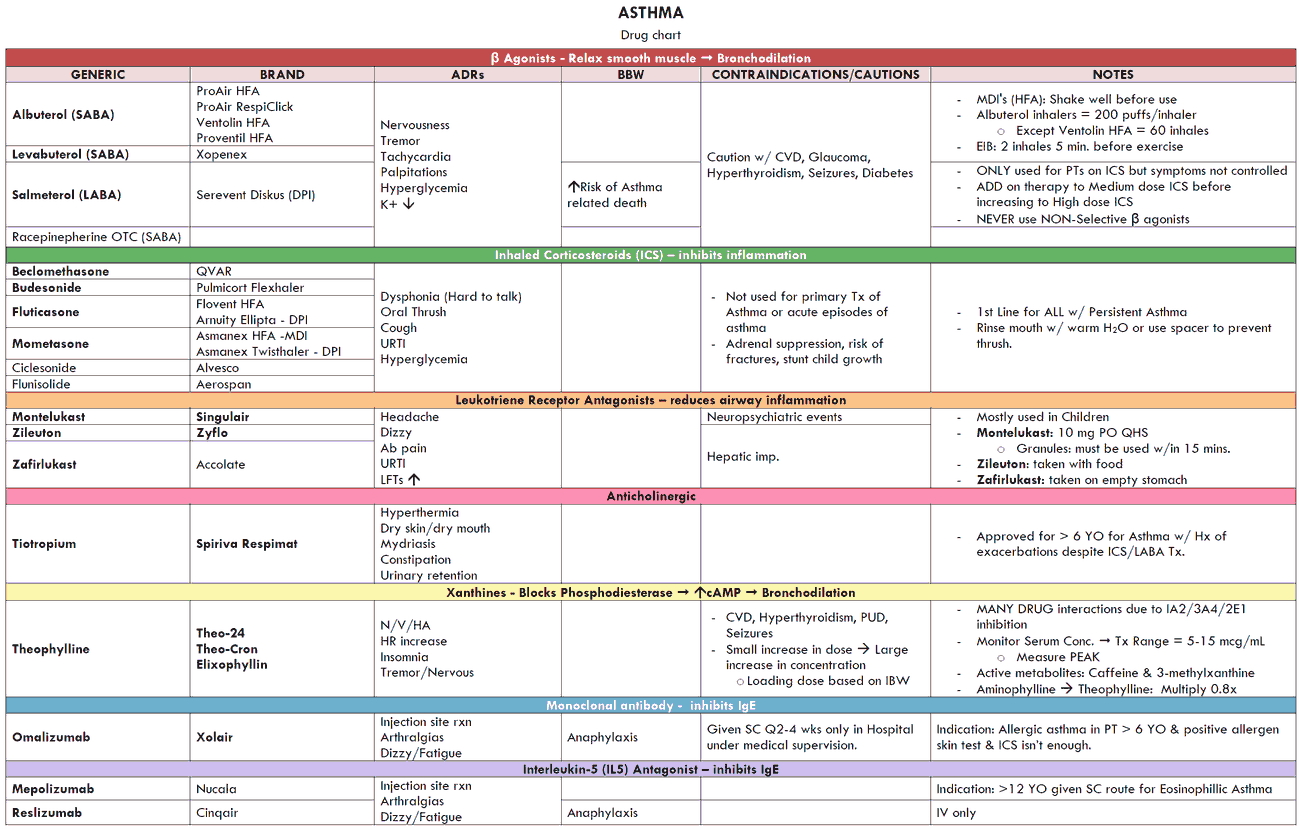 Severe asthma can be treated with long-acting inhaled β2 agonists, and antimuscarinic agents, (e.g., ipratropium). Note, however, that theophylline is not commonly used because of the need to check blood levels on a regular basis. Also note that ipratroprium is not used frequently for asthma but remains popular in the treatment of COPD.