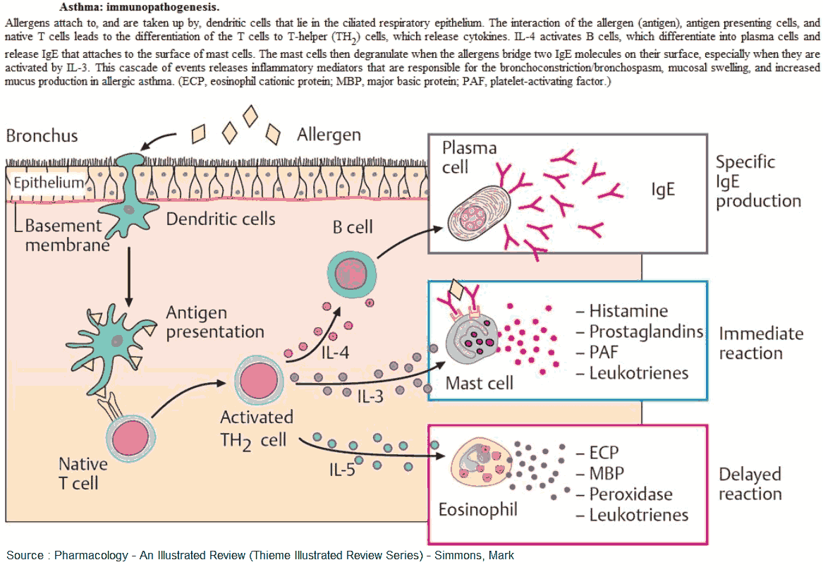 The clinical features of asthma probably derive from an interaction between the normally resident and infiltrating inflammatory cells in the airways and the surface epithelium. These produce an intense immediate inflammatory reaction involving bronchoconstriction, vascular congestion, and edema formation-the pathologic hallmarks of asthma.
