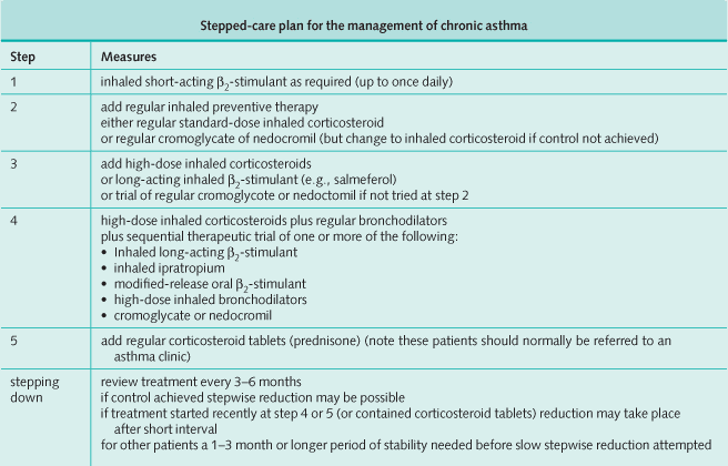 Some patients with severe recurrent symptoms need oral steroids in a single daily dose. Once control is reached and sustained for several weeks, a step-down reduction in therapy should be undertaken, beginning with the most toxic drug, to find the minimal amount of treatment needed to keep the patient well. The PEFR should be monitored and treatment adjusted accordingly, particularly when corroborated by the patient’s symptoms.