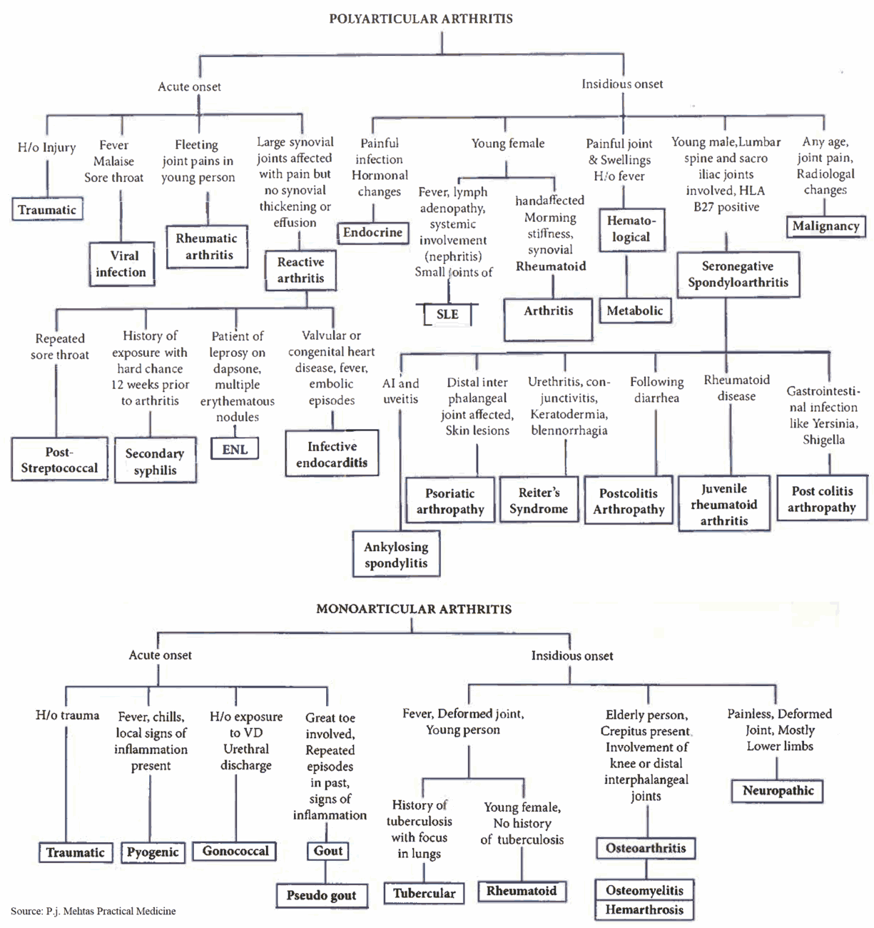The causes of joint pain can be remembered by the mnemonic SOFTER TISSUE: sepsis, osteoarthritis, fractures, tendon/muscle, epiphyseal, referred, tumor, ischemia, seropositive arthritides, seronegative arthritides, urate, extra-articular rheumatism (e.g., polymyalgia).