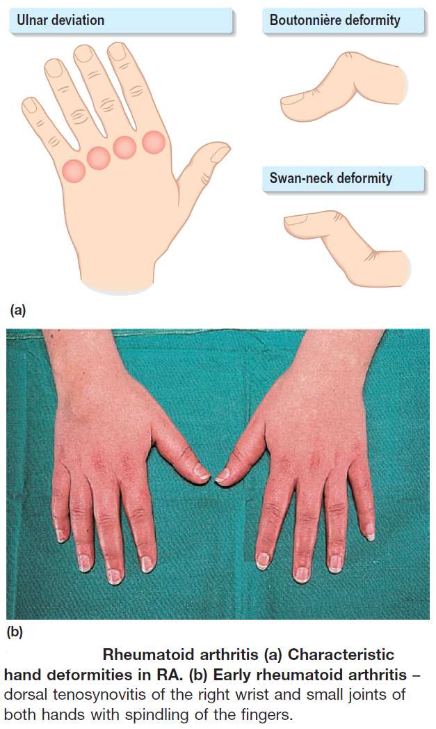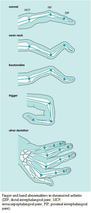 - Swan neck deformity: hyperextension of the PIP joints and flexion of the MCP and distal interphalangeal (DIP) joints.