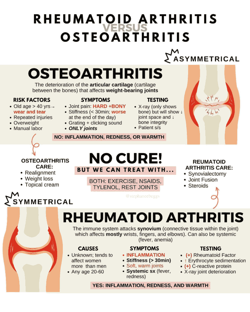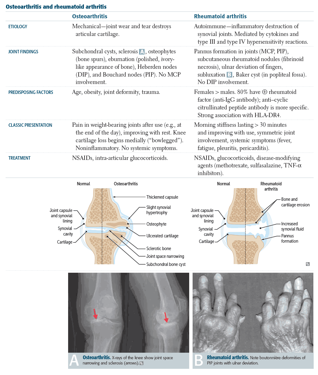 - Patient’s age: RA classically affects women aged 25-55 years, and OA usually occurs in patients over 40.