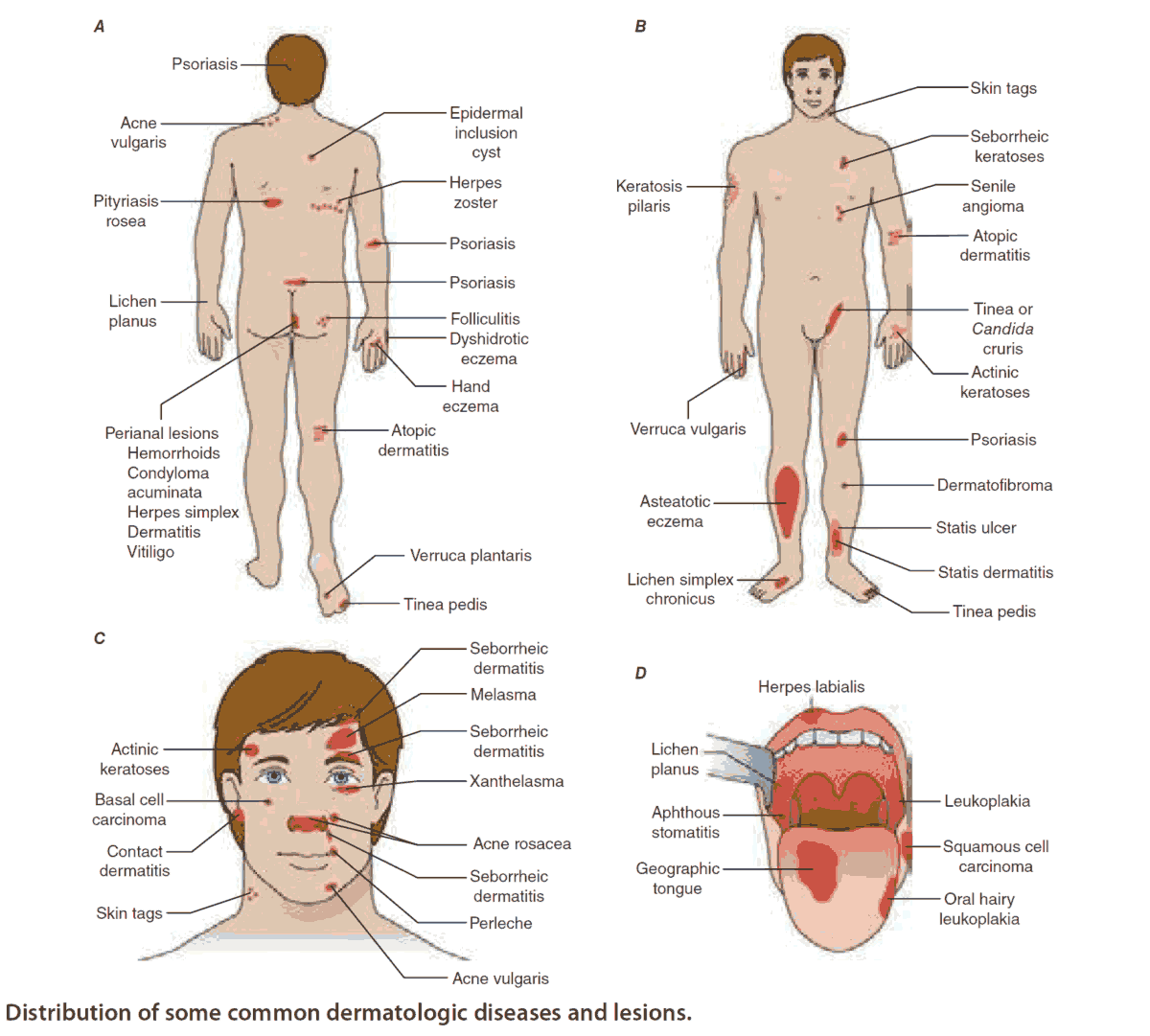 Always examine the entire skin and look in the mouth (e.g., with lichen planus, herpes simplex and zoster, and infective exanthemata). Rashes may change with time and become characteristic or diagnostic of common dermatoses, such as the infectious exanthemata. Look at the distribution of lesions: