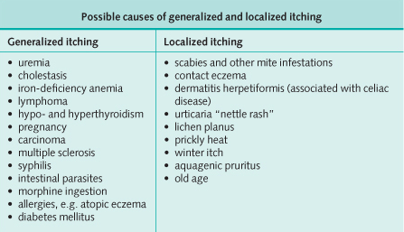 - Itching (image below): atopy or urticaria (e.g., scabies, which is worse in bed), eczema, dermatitis herpetiformis, lichen planus, flexural psoriasis.